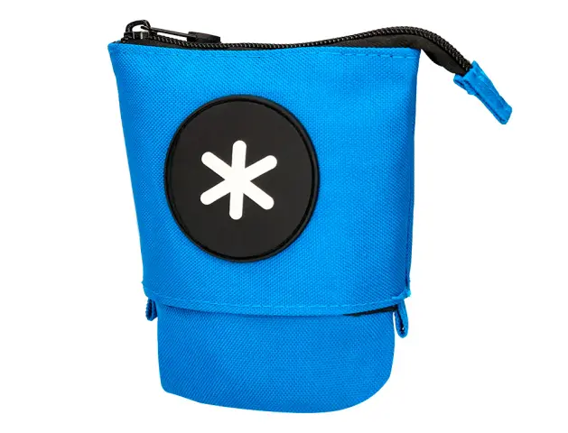 Bolso escolar portatodo Antartik con una cremallera. Panel plegable convertible en cubilete, muy práctico y versátil. Color azul.